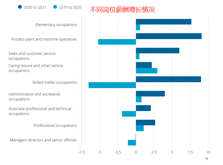 行政、秘书类岗位薪酬同比上涨了4%;经理、董事和高级官员(senior officials)的薪酬增速为零。整体来看,低薪岗位的年收入上涨幅度更高,复工、复产带来的薪酬提升起到了较为明显的效果。
