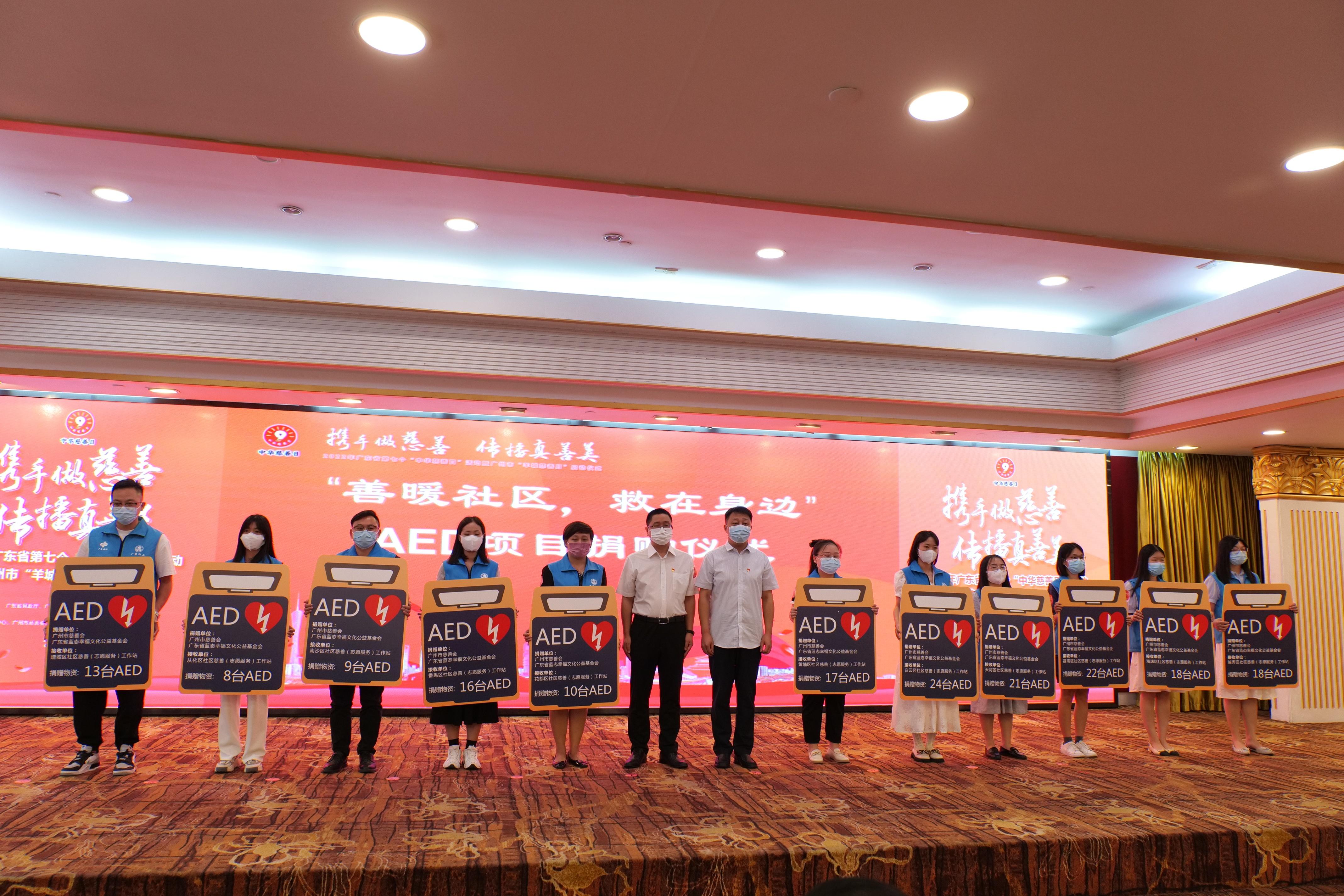 活动现场,广州市慈善会、广东省蓝态幸福文化公益基金会联合向全市176个镇(街)各捐赠1台AED自动体外除颤器。