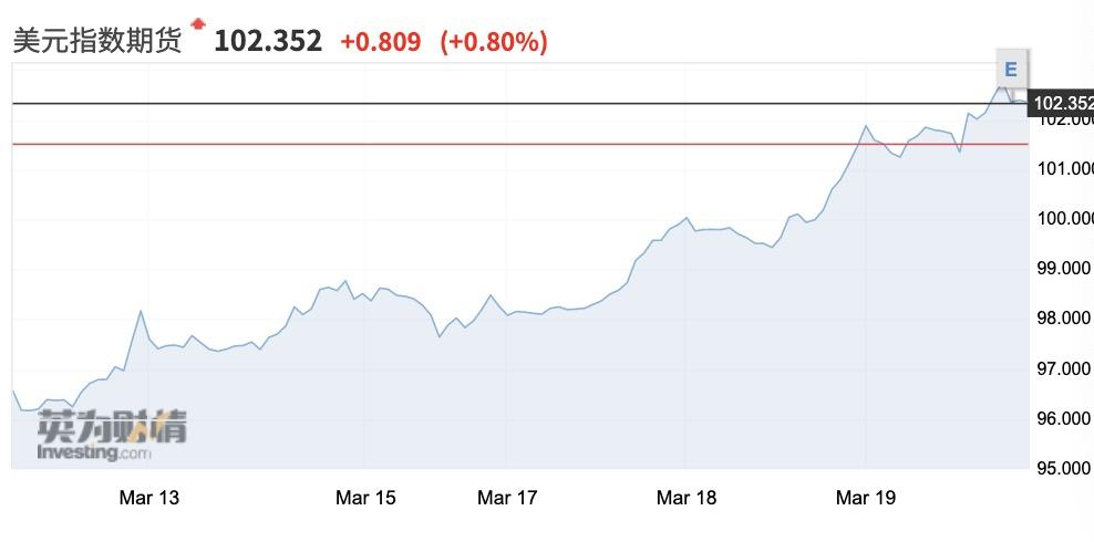 北京时间3月18日20时左右,美元指数时隔四年再度突破100大关,此后迅速攀升,并在19日下午突破102,截至当日晚7时报102.4,突破2016年的最高点,美元当日走强导致澳元、韩元、新西兰元等汇率市场出现暴跌。周三英镑对美元一度下跌超过5%,刷新1985年以来的新低至1.1446。