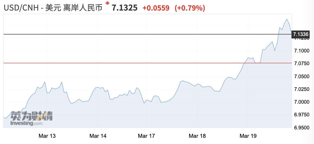 3月19日,人民币对美元中间价调贬194点,报7.0522,离岸人民币对美元走贬至7.15附近。3月初,人民币最强至6.92附近。