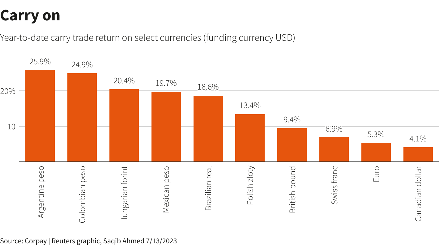通过抛售美元并买入哥伦比亚比索的投资者今年迄今将获得了25%的回报,而抛售美元买入波兰兹罗提的回报率为13%