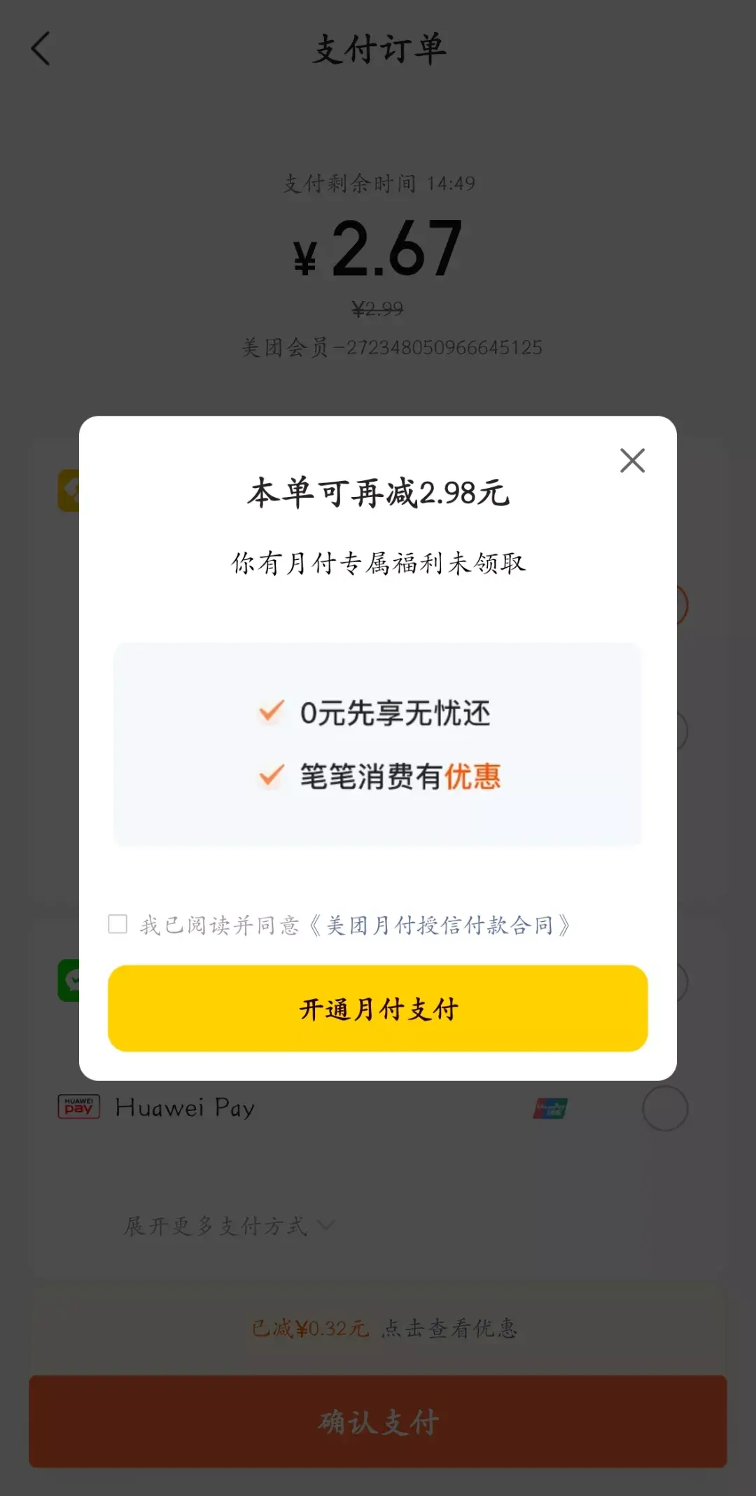 可以看出,美团小贷修正了默认开通“美团月付”的做法,但仍然试图通过弹窗优先展示,对用户加以引导,并使用“月付专属福利”、“0元先享无忧还”等描述,诱导用户点击,且未显著提示其小额消费贷款的性质,其背后的逻辑仍然是利用用户使用习惯使其在不知详情的前提下作出意思表示。