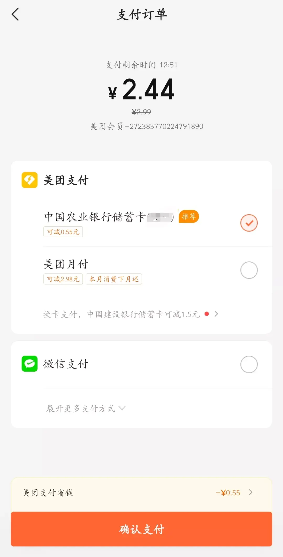 页面中,如使用“美团月付”仍需勾选,笔者退出后再次进入月卡开通支付界面后,页面展示了绑定银行卡、“美团月付”、微信以及支付宝等四种支付方式。