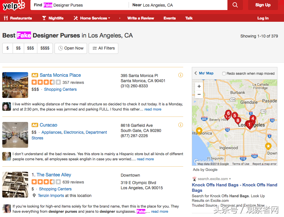 (Yelp,美国的大众点评网,标出了洛杉矶诸多可以买到假名牌的商店和市场,从太阳镜到名牌包,一应俱全。