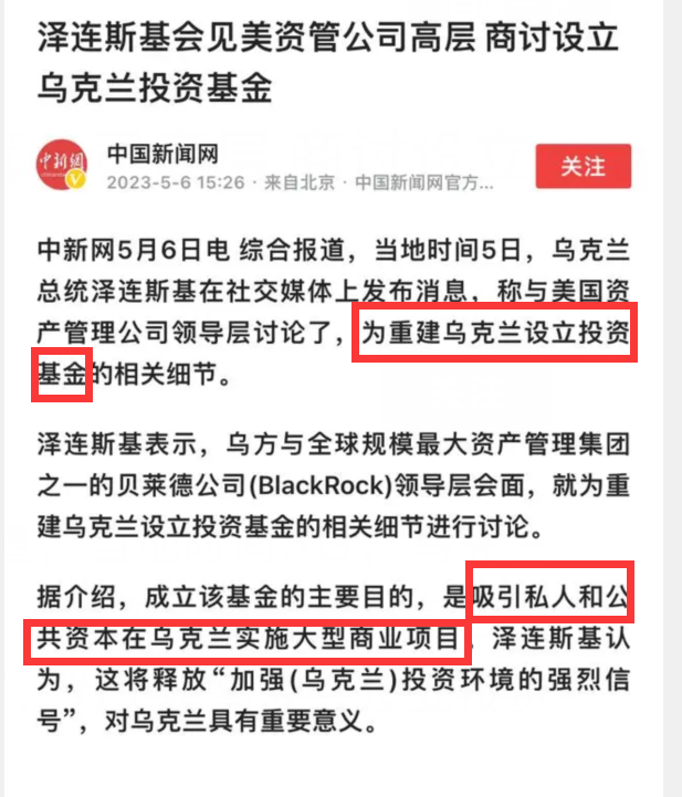 据中新社报道,泽连斯基签署的协议是请贝莱德公司设立一个乌克兰重建基金,为乌克兰的重建招募商业项目的投资。这倒确实是贝莱德的本行和强项。