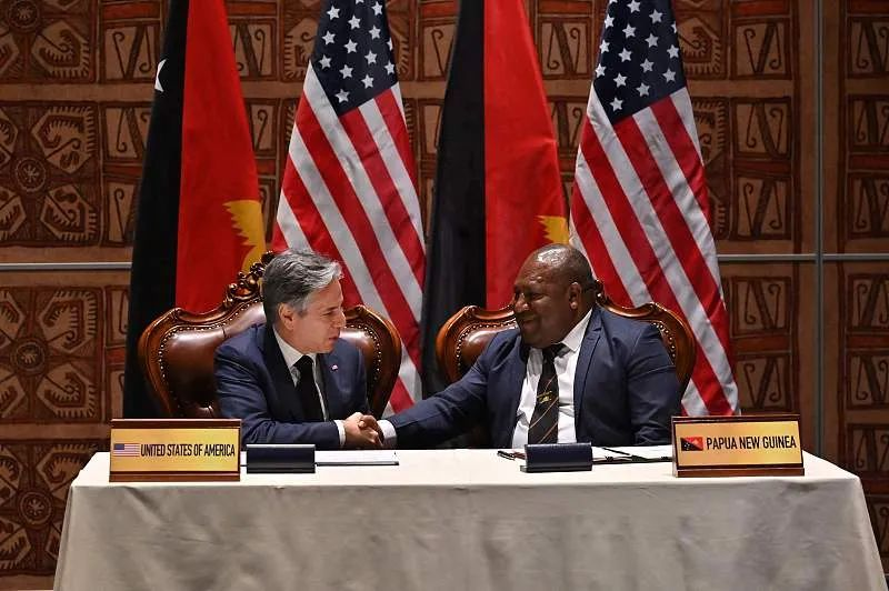 5月,美国国务卿布林肯(左)和巴布亚新几内亚国防部长温·达基在签署防务协议后握手。图源:视觉中国