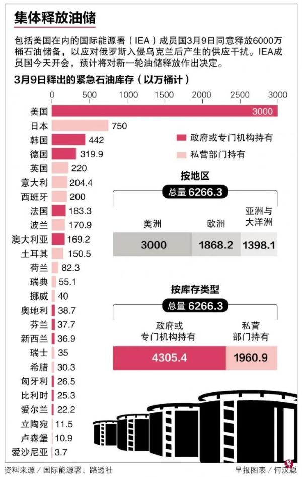 3月9日,美国等多国释放原油以应对冲击。图片来源:新加坡《联合早报》/何汉聪