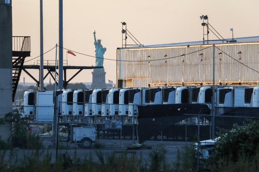 这是2021年9月6日在美国纽约布鲁克林拍摄的一处临时停尸场内存放新冠患者遗体的冷藏车。新华社记者 王迎 摄