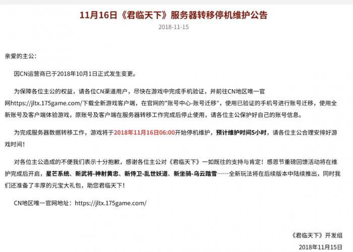 (图说:关于《君临天下》运营商发生变更的公告)
