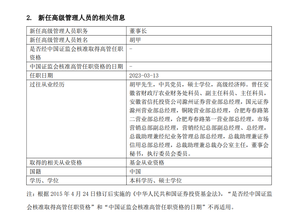 公告显示,胡甲曾任安徽省财政厅农业财务处科员、副主任科员、主任科员, 安徽省信托投资公司滁州证券营业部总经理。之后加入国元证券,担任多个营业部总经理职务,随后成为公司高管,担任总裁助理兼总裁办公室主任、董事会秘书等职务。