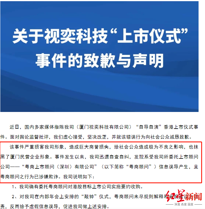 3月21日,红星资本局注意到,视奕科技终于在其官方微信公众号上道歉。在道歉声明指出,此次事件发生的原因是受公司委托的上市顾问公司——“粤商上市顾问(深圳)有限公司”(以下简称:“粤商顾问”)信息误导产生。