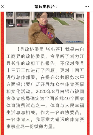 据今年2月6日靖远电视台官微报道,来自工商界政协委员张小燕听了刘力江县长作的政府工作报告后表示,“体育与人民幸福生活息息相关,作为一名政协委员,一名体育人,我愿意为靖远的体育赛事事业尽一份微薄力量。”