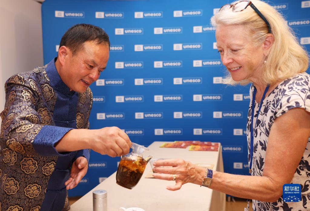7月11日,在位于法国巴黎的联合国教科文组织总部,嘉宾品尝南京雨花茶。新华社记者 高静 摄