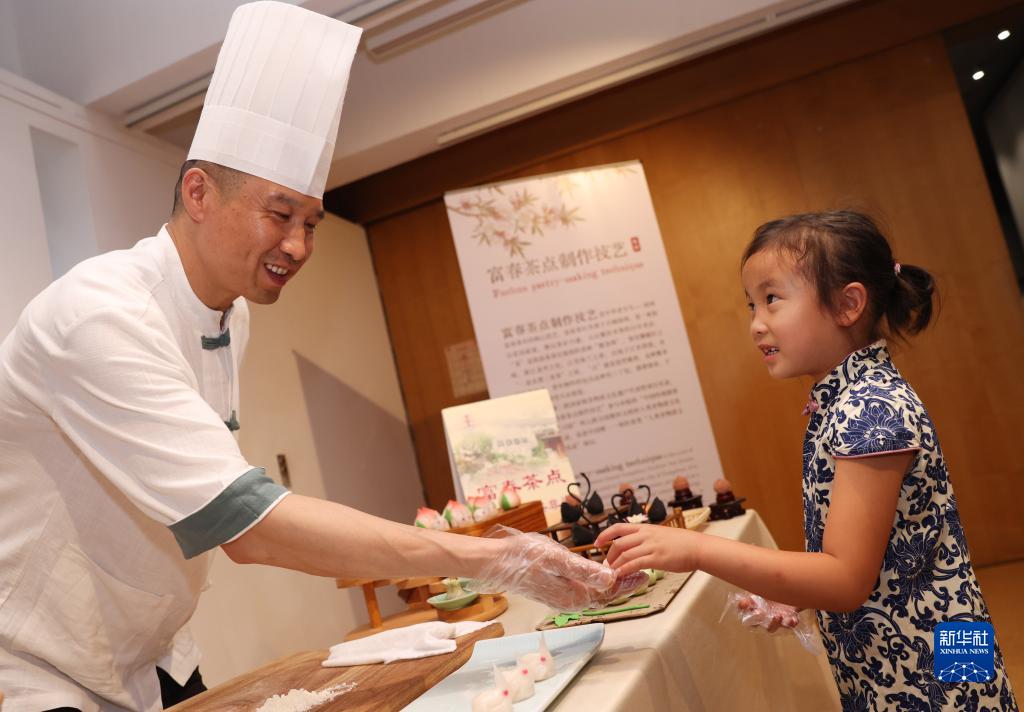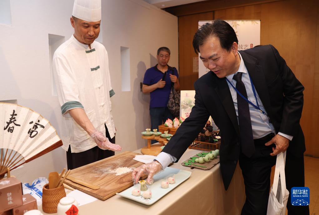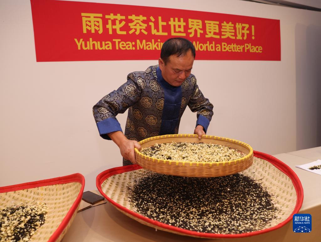 7月11日,在位于法国巴黎的联合国教科文组织总部,南京雨花茶传承人陈盛峰演示制作雨花茶。新华社记者 高静 摄