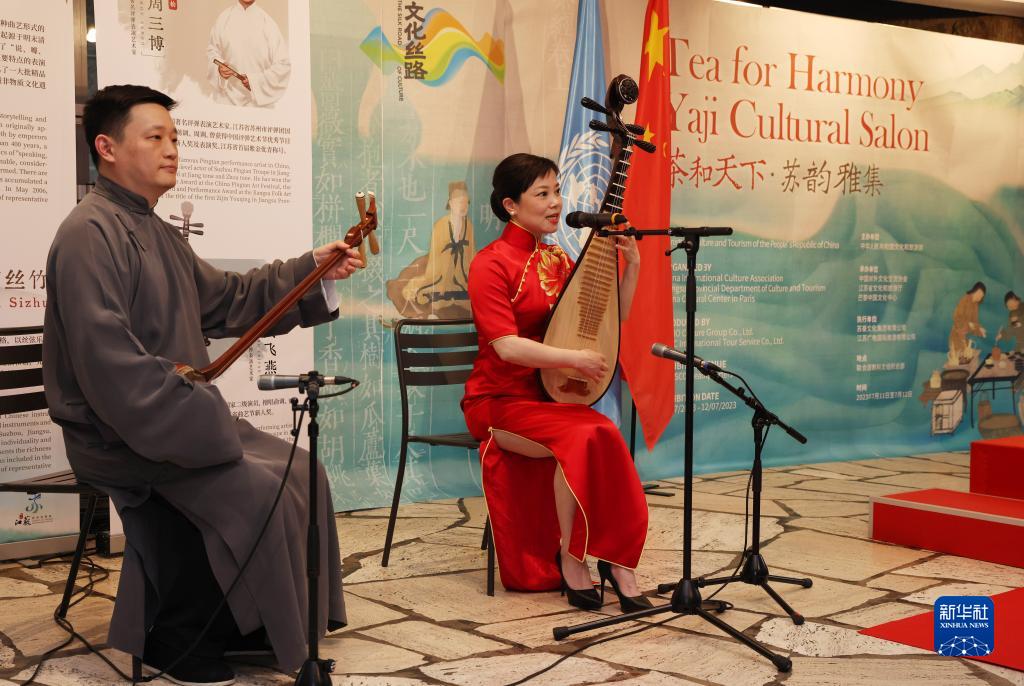 7月11日,在位于法国巴黎的联合国教科文组织总部,中国评弹表演艺术家在活动上演奏。新华社记者 高静 摄