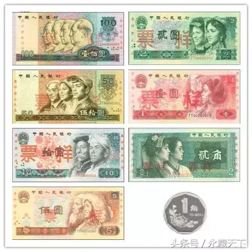 第四套人民币100元、50元、10元、5元、2元、1元、2角纸币和1角硬币