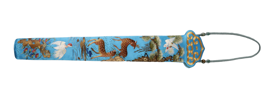 扇套是收纳折扇的袋囊,细长的方寸之间绣制着各色精致图案,极尽华美工细,在明清时期颇受文人雅士的青睐。本件扇套以细平绣、盘金针法绣制。“鹿鹤同春”谐音“六合同春”,取天下皆春,万物欣欣向荣之意。