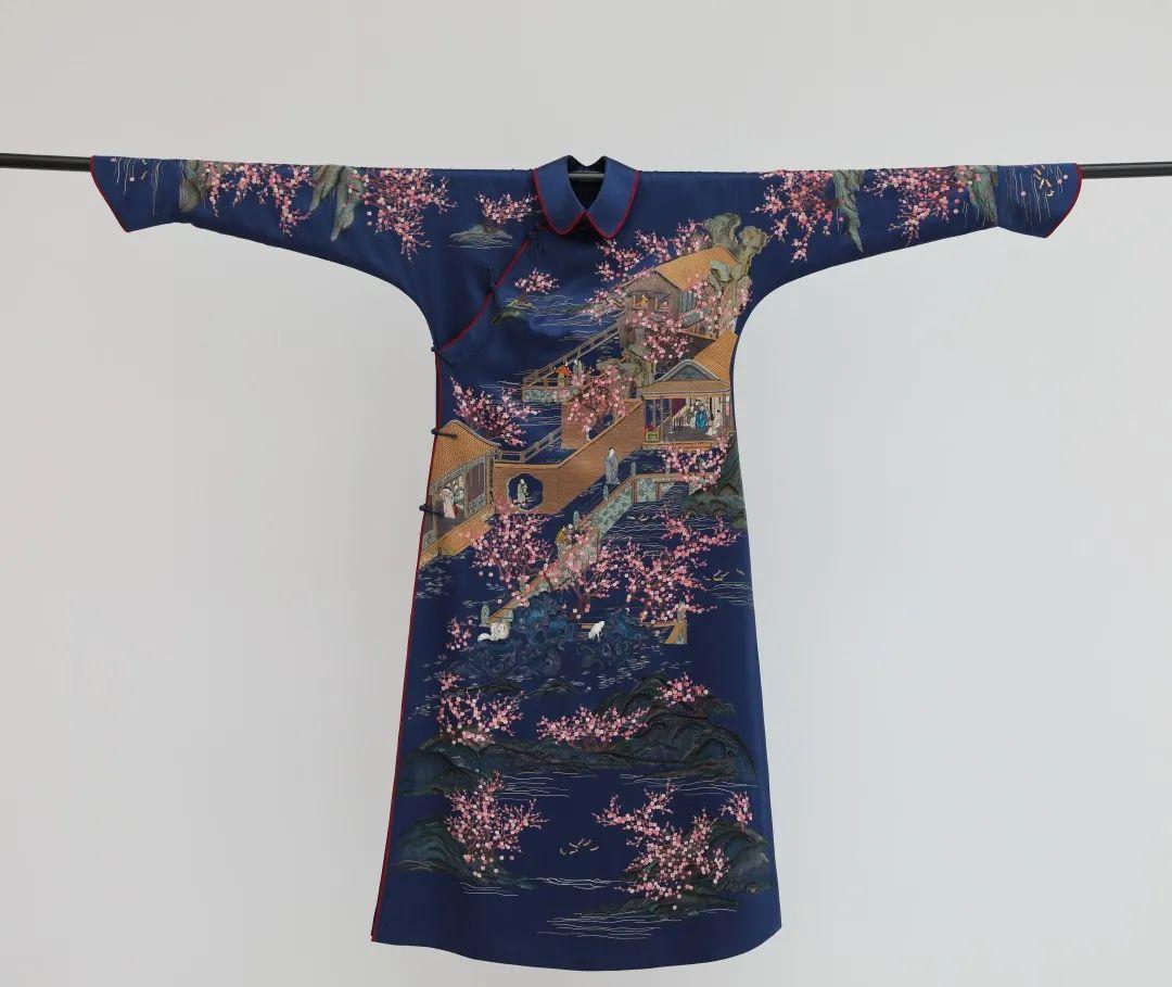 作品《万物生旗袍》灵感来源于清代《十二月月令图》中的民间节令与风俗画。农历二月,《尔雅•释天》:“二月为如。”又据郝懿行义疏云:“如者,随从之义,万物相随而出,如如然也。”旗袍用素绉缎,针法采用细平绣、管绣、纳纱绣、虚实、滚针等,物象描写细腻,庭园景致生动。既有梅花绽放、假山奇石,又有诗人信步、孩童嬉笑,一派万物复苏、生机盎然之景