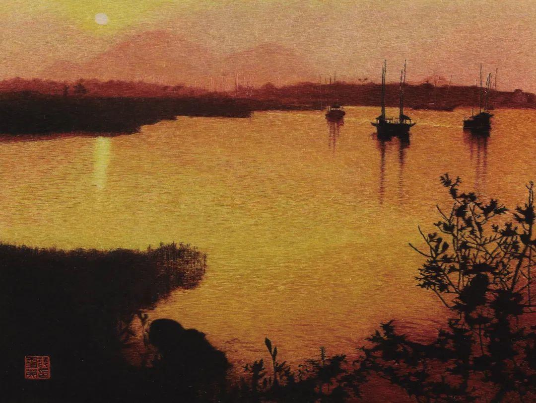 作品描绘了太湖峡坞内夕阳西下、渔船丰收归航的宏大场景。技法以散套针、虚实针为主,兼用撒和针,撕毛针、细乱针等,并采用90多种不同颜色的丝线,精细处把一根丝线分成1/48进行刺绣,使画面层次分明,颇有意境。