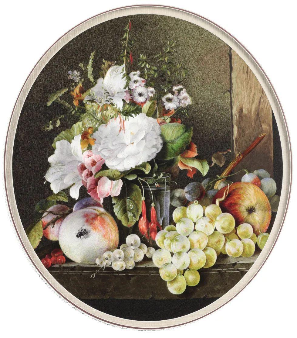 仿真绣由清末著名刺绣匠人沈寿创造,特点是将西方油画的光影效果与古老的刺绣艺术相结合。作品用旋针绣搭配细平绣、乱针绣等传统针法,使图案转折自然,将水果、花朵的肌理刻画得栩栩如生。绣面细腻平整,光彩柔和,极具立体感。