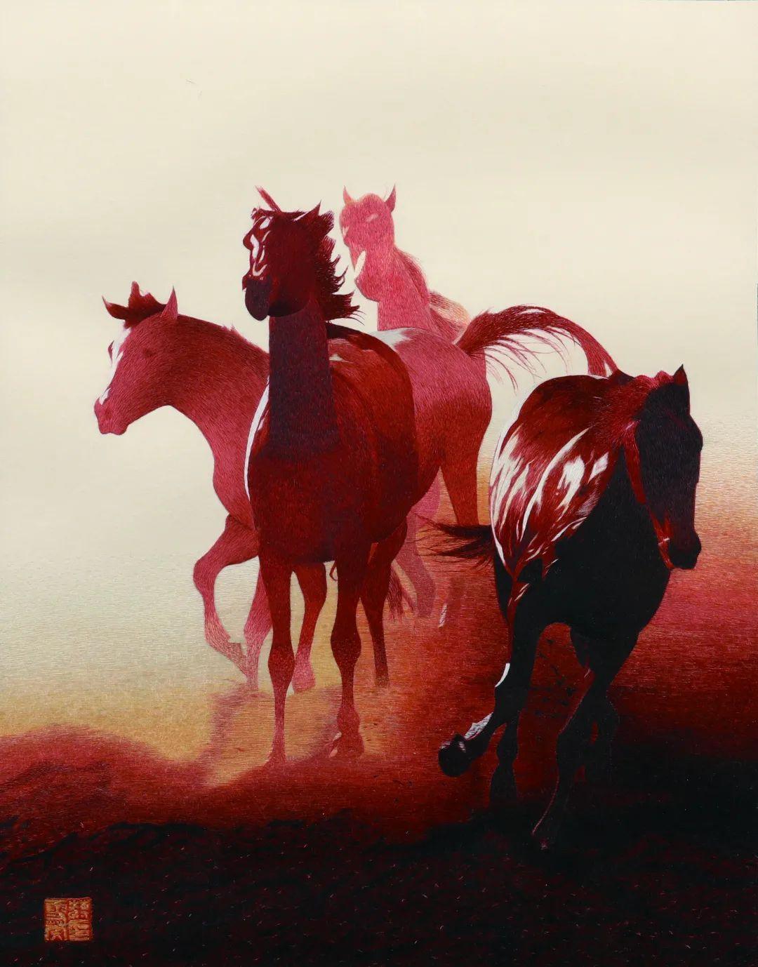 展厅中,作品《晓马》是蒋雪英的代表作之一,采用虚实结合的技法绣制,前方骏马以散套和撕针为主,后方奔驰的马群及地面以虚实针为主,画面兼具立体感与朦胧感。