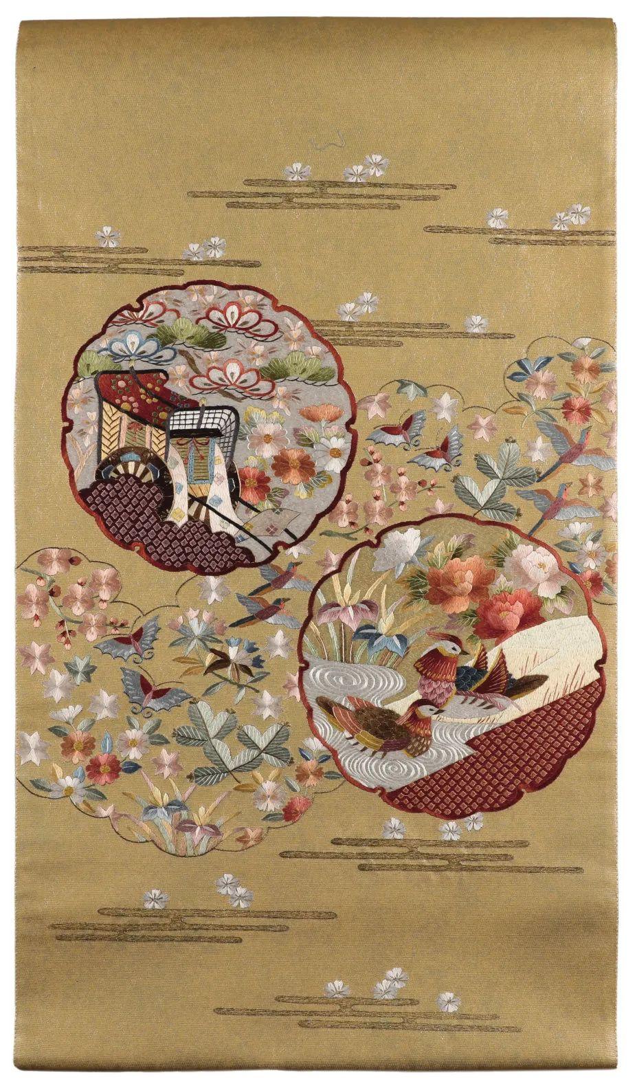 二十世纪七十年代,中日关系转暖。因苏绣图案雅致、技艺精湛,苏绣和服腰带开始在日本上层阶级之间流行起来,一时间需求量大增,价格是普通和服腰带的好几倍,有时一件可达数百万日元。此作品绣制于八十年代,采用细平绣,色彩丰满、精美典雅。
