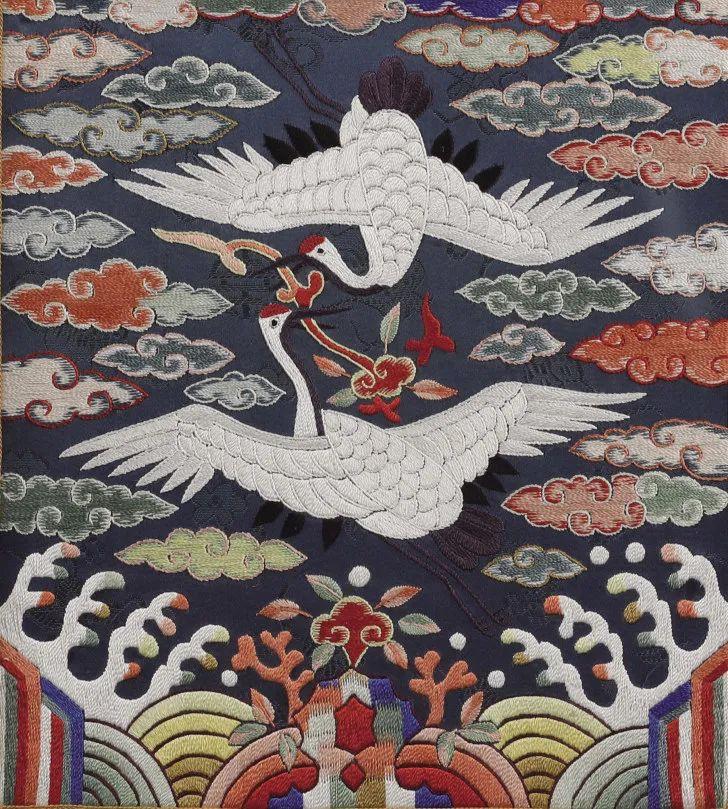 这件官补是一品官员所用的仙鹤图案,象征“一品高升”,本是上世纪九十年代韩国商人订购的戏服绣片。1997年金融危机席卷亚洲,企业倒闭,工人失业,社会经济萧条,已经绣制好的绣片无处可销,继而得以保存下来成为时代的见证。