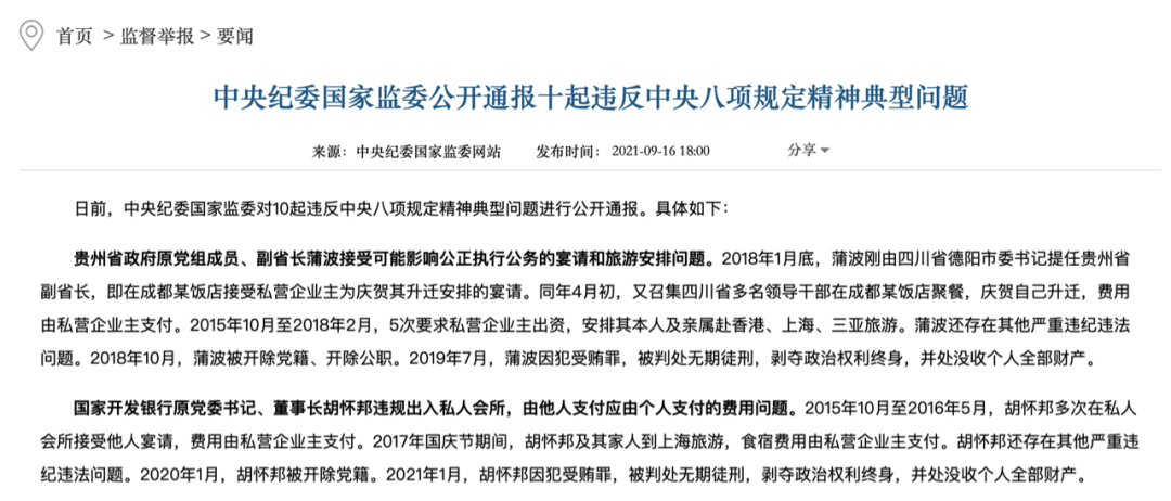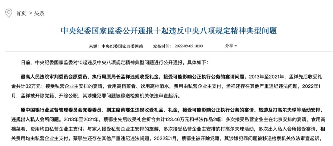 9月5日,中央纪委国家监委公开通报了十起违反中央八项规定精神典型问题,10个被点名的官员中,有5人是“老虎”。