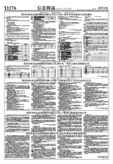 四川天味食品集团股份有限公司(以下简称“公司”)第三届董事会任期于2019年5月7日届满,公司依据《公司法》、《公司章程》等相关规定开展换届选举工作。现将本次董事会换届选举情况公告如下:公司第四届董事会由9名董事组成,其中非独立董事6名,独立董事3名。